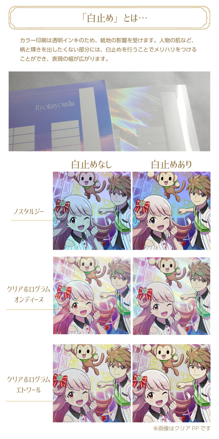 白止めを行った箇所につきましても、下地を完全に遮蔽することは出来ません。 - ・非常にキズがつきやすい用紙です。表面保護のためPP加工したものであっても、