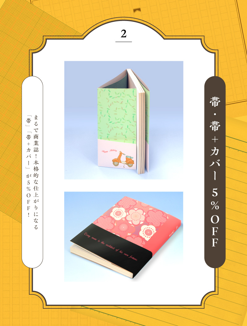 | フェア内容 | 「帯」「カバー+帯」オプション料金5%OFF! |