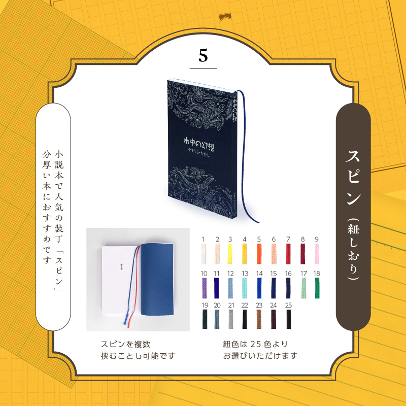 | 内容・仕様 | サイズ A5、B6、新書、A6(文庫) ※別サイズ要相談 綴じ 無線綴じ、上製本 背幅 原則10mm以上 組色 25色より選択 |