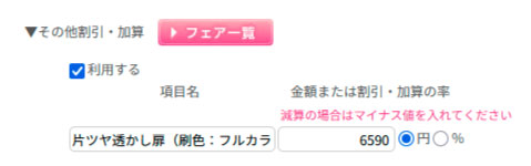 「金額または割引・加算の率」欄に「片ツヤ透かし扉料金(価格表参照)」をご申請ください。