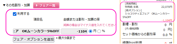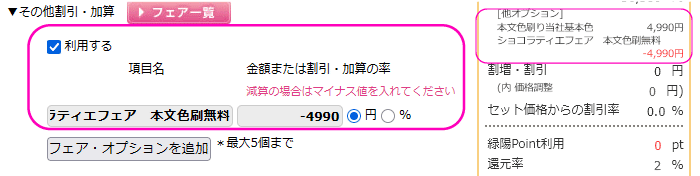 例:「ショコラティエフェア 本文色刷無料」「料金(見積結果に表示される本文色刷オプション価格をマイナス値で入力)」「円」