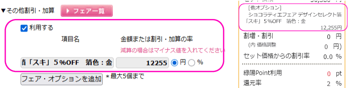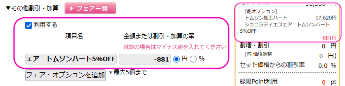 例:【ショコラティエフェア トムソンハート5%OFF】【割引額(価格表の割引額をマイナス値で入力)】円