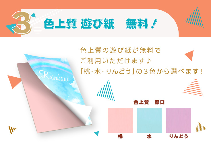2.「遊び紙」欄で「前のみ」にチェックを入れ、「色上質 厚口 桃 / 水 / りんどう」からお好きな色をお選びください。