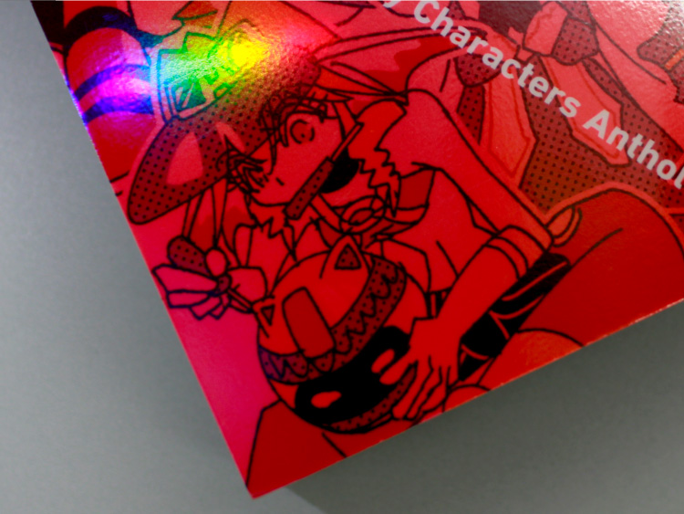 加工に関しては、表紙にNEONカラーとホログラムPPイリディセントを使用し、