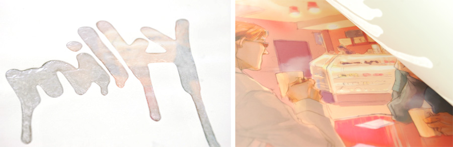 箔押しはHOT STAMPと英語で言うように、熱で転写します。この紙は熱をかけると表面が溶けて、もともとの白い紙地が半透明になるのです。飴が溶けたような感じと言って良いでしょうか。ですから、「milky」というタイトル文字が溶けたように見えるのです。そしてイズミさんは、それを狙ったロゴ字を作っています。本文は半晒しクラフトにスミ刷り。渋いなぁ~というのがいつもの感想。