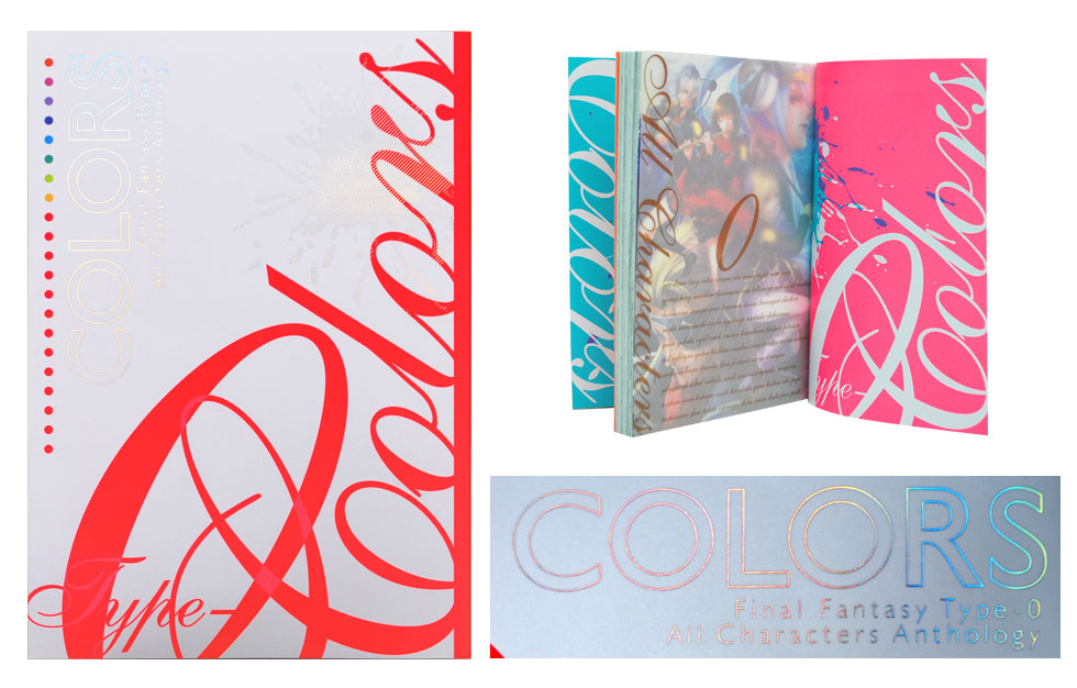 今回はFF零式作品からのキーワード「虹」「朱」そして虹から派生したタイトル「COLORS」の三点をテーマにデザインを考えた結果の装丁でした。