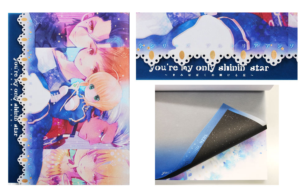 次のトレペの濃い青のグラデーションの印刷が、明け方の空を表すようで美しい。そこにタイトル「you're my only shinin' star ~きみはぼくの輝ける星~」が銀箔で印字されています。