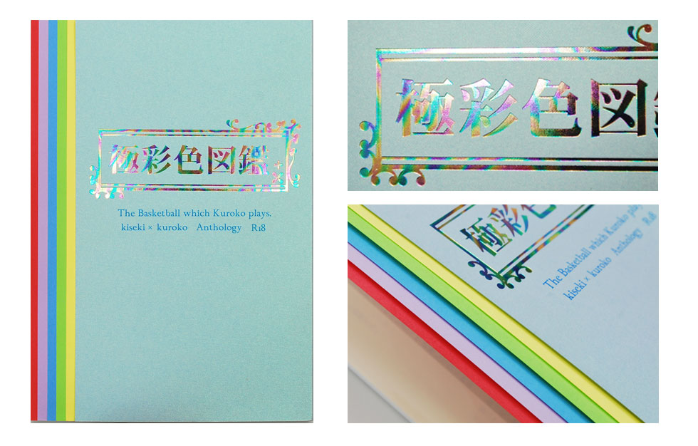 黒子のバスケの小説本のアンソロジーです。表紙はリアクションFSアクア、落ち着いた感じのメタリックの紙です。表1はタイトルをレインボー箔で押しているだけ。イラストは使用されていません。