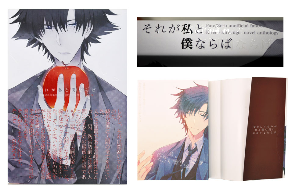 色々な紙の中から表紙の紙は質感や色合いがメインキャラクターのイメージのもの、表4では文字が角度によって見失うようにと思って銀インクを選んだのですが予想以上に綺麗に出ていて嬉しかったです。