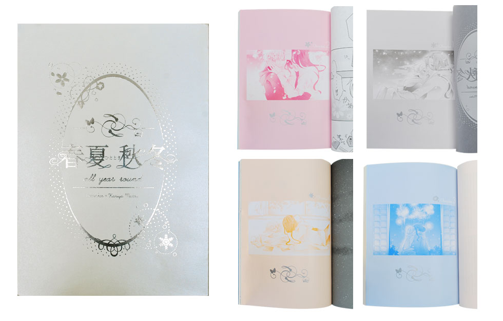 - 高精細箔(銀) / 特殊紙カラー(New特レーブル輝き) / トレペ扉 / 季節の遊び紙(新・星物語) / 本文紙替 / 表2-3印刷 / 2色刷扉
