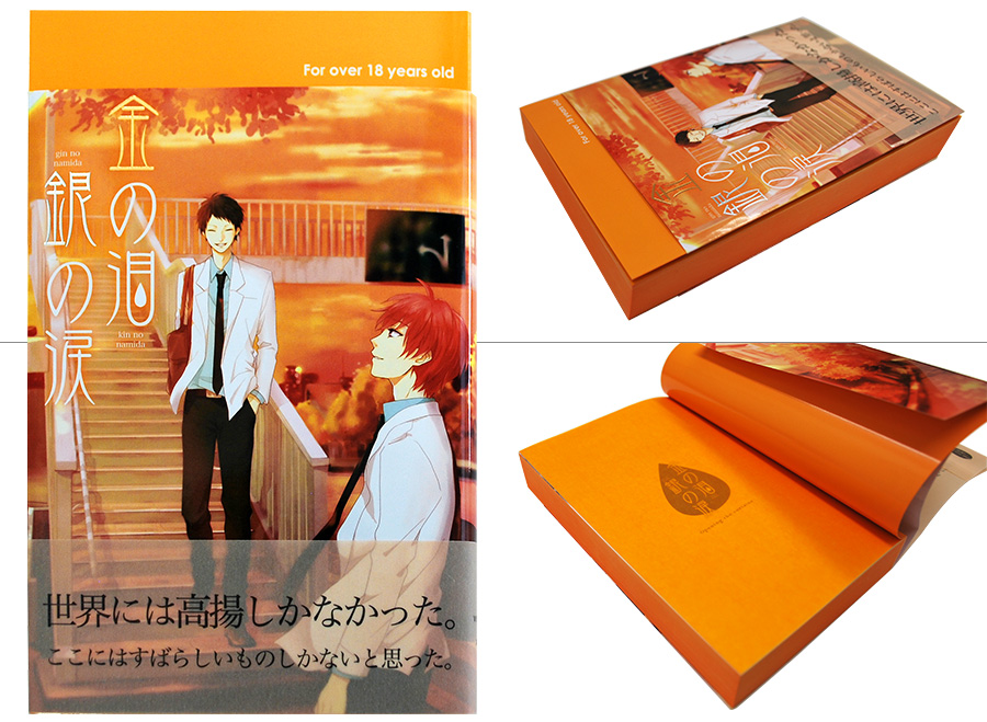 カバーはオレンジの美しい夕焼け風景。それを背景に階段をゆっくり降りてくる虹村の肩先に「金の泪 銀の涙」の金・銀の文字の金箔・銀箔が浮かび上がってきます。表1・表4のオレンジのベタも良し。クリアPPを貼っているんですが、作者の方は表2-3のPPも希望されました。製本の支障でニス引きでご了解を頂きましたが、この方の意図は解ります。表紙を開くとクロマティコというトレぺのマンゴ色の遊び紙、このオレンジ色が他の色とドンピシャと合っているのが不思議!