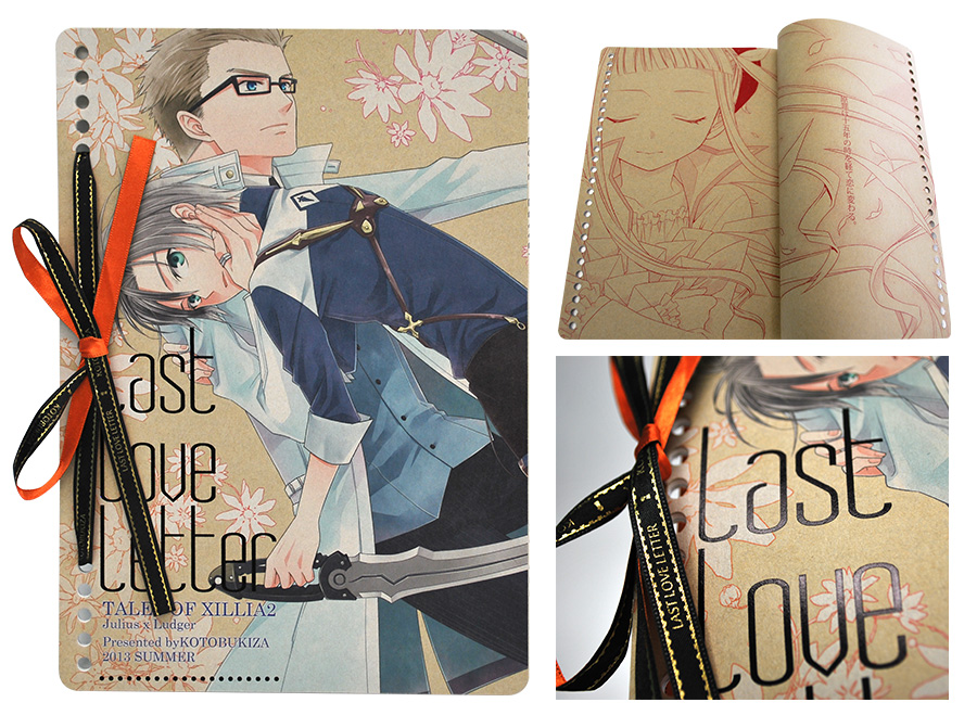 - 小口側にルーズリーフの穴を開けてリボンを通し、蝶結びしてあります。「リボンを解かないと読めない」というのが、まるで袋とじのように好奇心を誘います。またタイトルには黒箔が使用され、細い文字のデザインでも背景に負けないインパクトを与えています。リボンもオリジナルデザインで印刷され、隅々まで愛情のこもった1冊です。