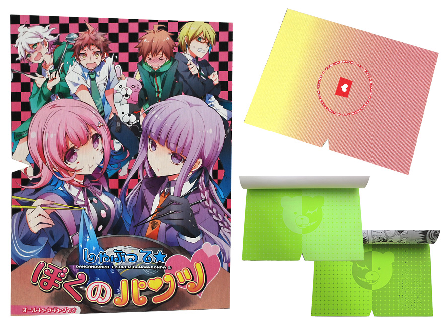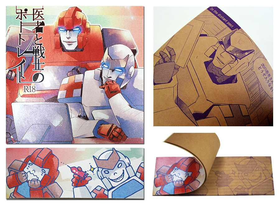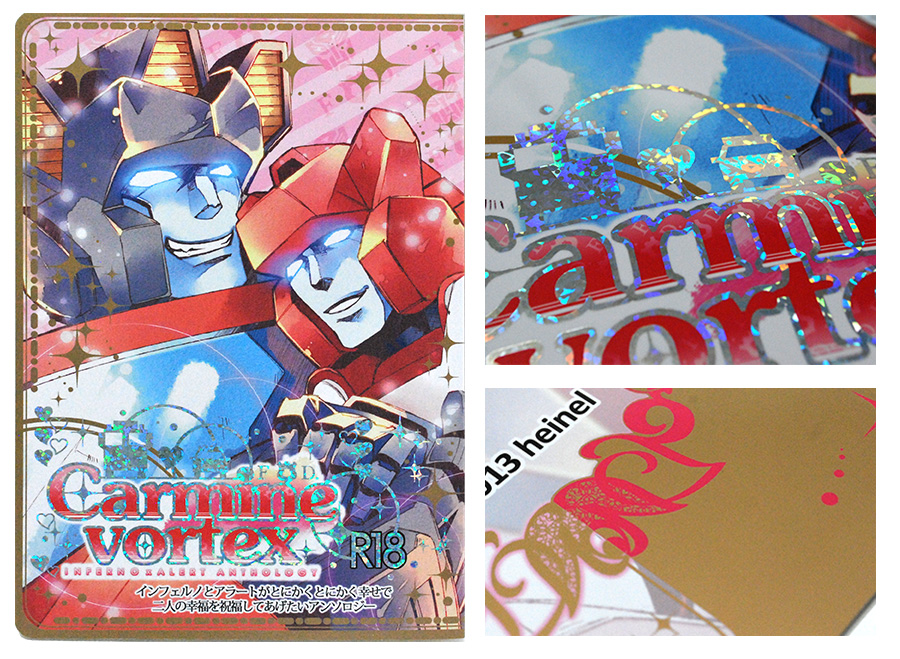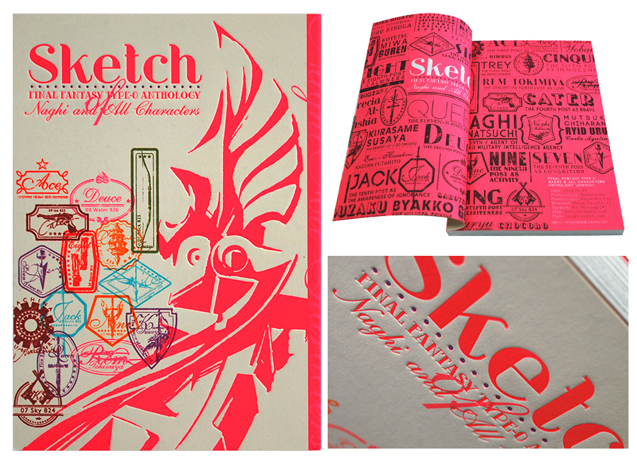 活版印刷風の加工とコットン紙への蛍光インク+多色刷+つや消し金の落ち着いた箔押しでレトロポップな印象になり、メインキャラのイメージを入れつつも、オールキャラアンソロである所をうまく表現できたと思います。表紙裏の赤→トビラ赤茶→めくると赤と色変化する所もメインキャラを象徴する三色です。