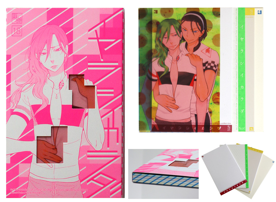 『イヤラシイカラダ』は高透明フィルムのスリーブケースと表紙で作り出すだまし絵が秀逸です。1色刷ではキャラクターが自分の手で自分を抱き、4色刷のスリーブケースを被せると相方のキャラに抱かれるように見える。タイトルに合ったアイデアです。