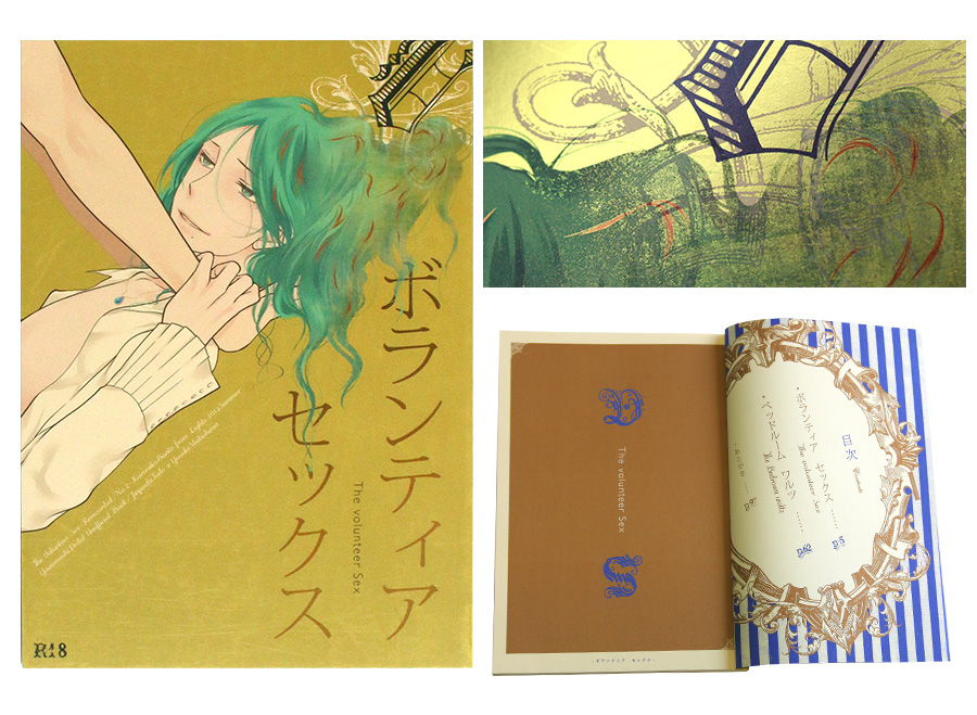 『ボランティア・セックス』の金(赤口)とフランスの色ブルー・デュール(DIC/F38)の組み合わせへのこだわりは共感します。表紙はオフメタルN金という金ピカな紙にカラー刷りをして、マット貼りをしています。この「金ピカ→マット」が作り出すシックな世界が素晴らしいです。ブルー・デュールもいい色ですよね。