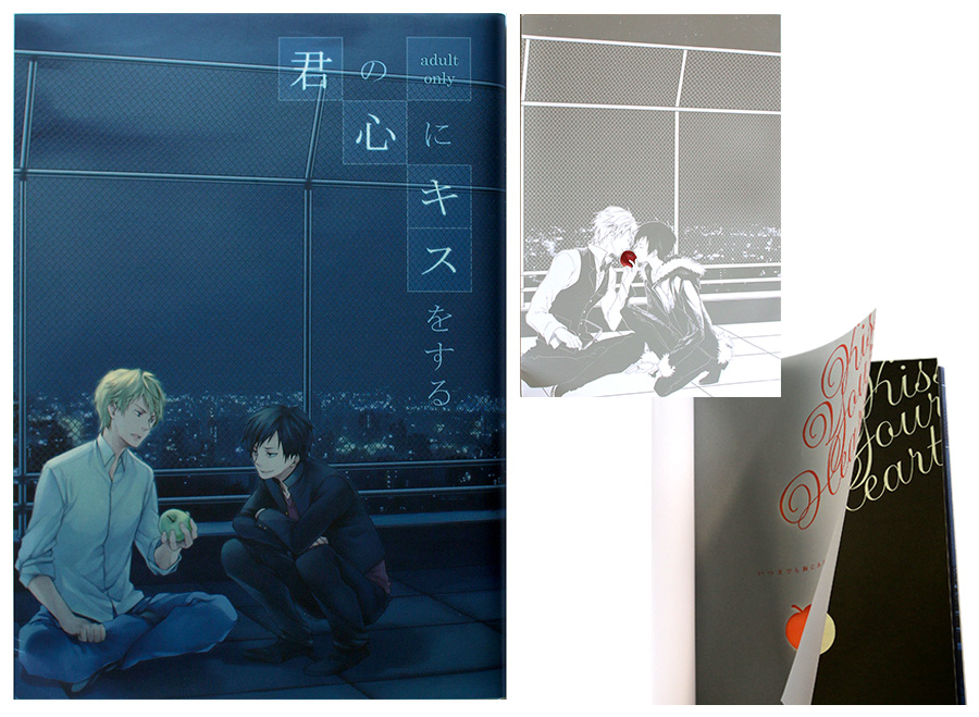 「君の心にキスをする」では、林檎を恋心に擬えております。池袋の夜景に合わせ、マットPPを施した淡く青色に輝くカバーを 捲れば、学生から大人へ時を経たふたりと赤く染まった林檎の変化が。また果実を際立たせるため表紙は銀刷りに。さらに遊び紙+扉でも林檎が染まる演出をさせて頂きました。