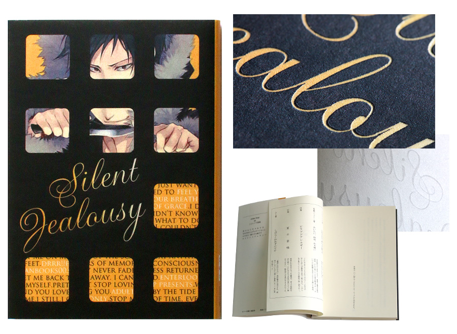 - トムソン加工 / シール貼り / カラー口絵 / 箔押し(ホログラム箔銀河) / 特殊紙表紙(オーロラコート) / 表2-3印刷 / 本文紙替(再生色上質)