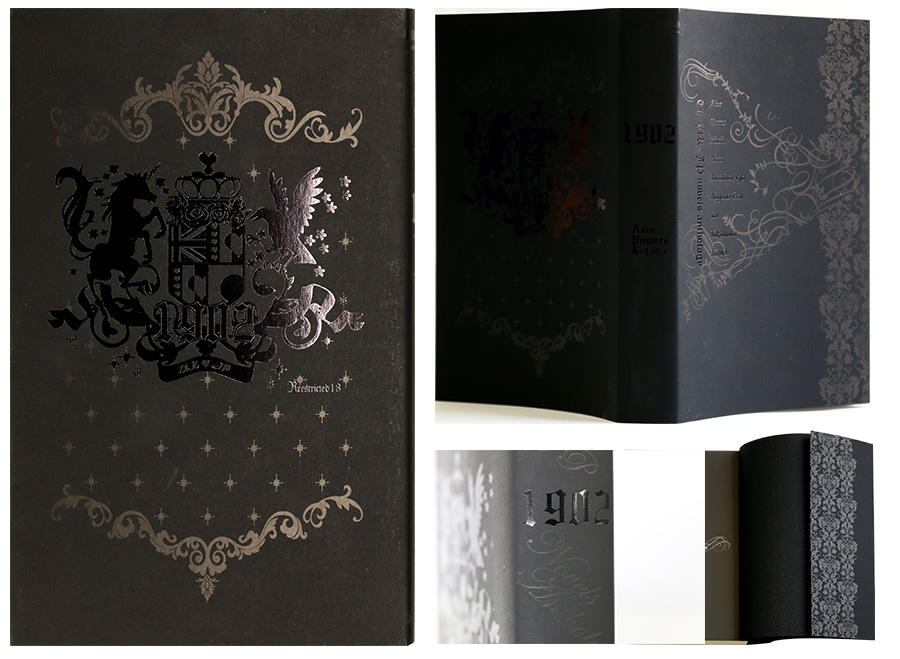 上品なロゴにはモチーフがたくさん- 表紙に箔押しされたロゴは、国旗・ユニコーンとカラス、六芒星と桜など内容に合わせたモチーフが美しく散りばめられています。