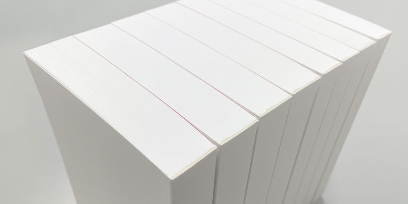 平らに積んだときにも美しく見えるよう、背や断裁面の仕上がりも量産前に細かくチェックしています。